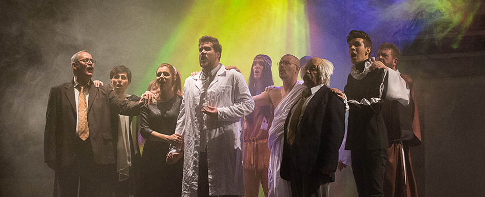 A színpadkép jelzésértékű, egy padlás tárul a nézők szeme elé, majd Mutter (Takácsné Bertalan Zsuzsanna) a virágárus jelenik meg a színen, akitől megtudjuk, hogy az egész környéket kilakoltatták, ezért Herznél (Varga Christian) keres menedéket, hisz ő egy „díszpinty”, a fizika doktora. Herz egy olyan gépen dolgozik, ami elmúlt lelkeket képes megidézni, egyelőre még „csak” a képzelet lényeit tudja előcsalogatni gépéből, de már nincs messze a cél. Ekkor jelenik meg Strasser ezredes (Bendes Zoltán) a kormány bérence, aki szemet vet a gépezetre, hiszen a legfontosabb, hogy uralják az emberek gondolatait is.